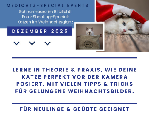 Die MediCatz-Special Events finden in kleinen Gruppen statt, sodass wir individuell auf Euch und Eure Katzen eingehen können. Manche Events sind mehrteilig (z. B. unser Fotoshooting-Special mit 3 Terminen), andere dauern nur einen Termin (z. B. unser Weihnachtskrimi) – immer mit viel Interaktion, Spaß & einer engen Verbindung zwischen Dir & Deiner Katze.